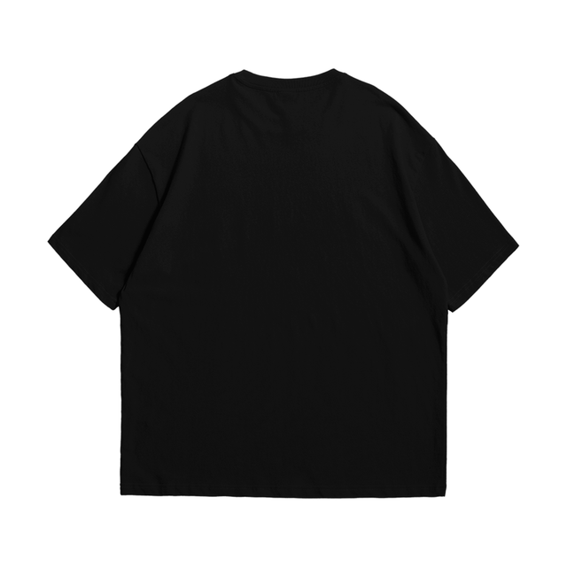 T-shirt à manches courtes noir à impression sérigraphiée en jaune et blanc sur torse.